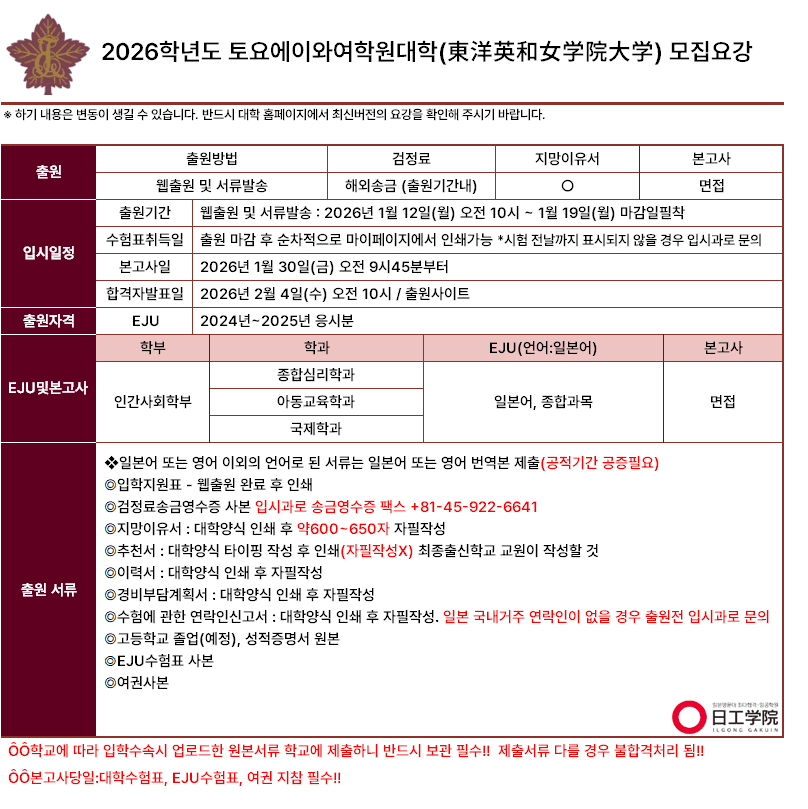 [사립] 2026학년도 토요에이와여학원대학 모집요강
