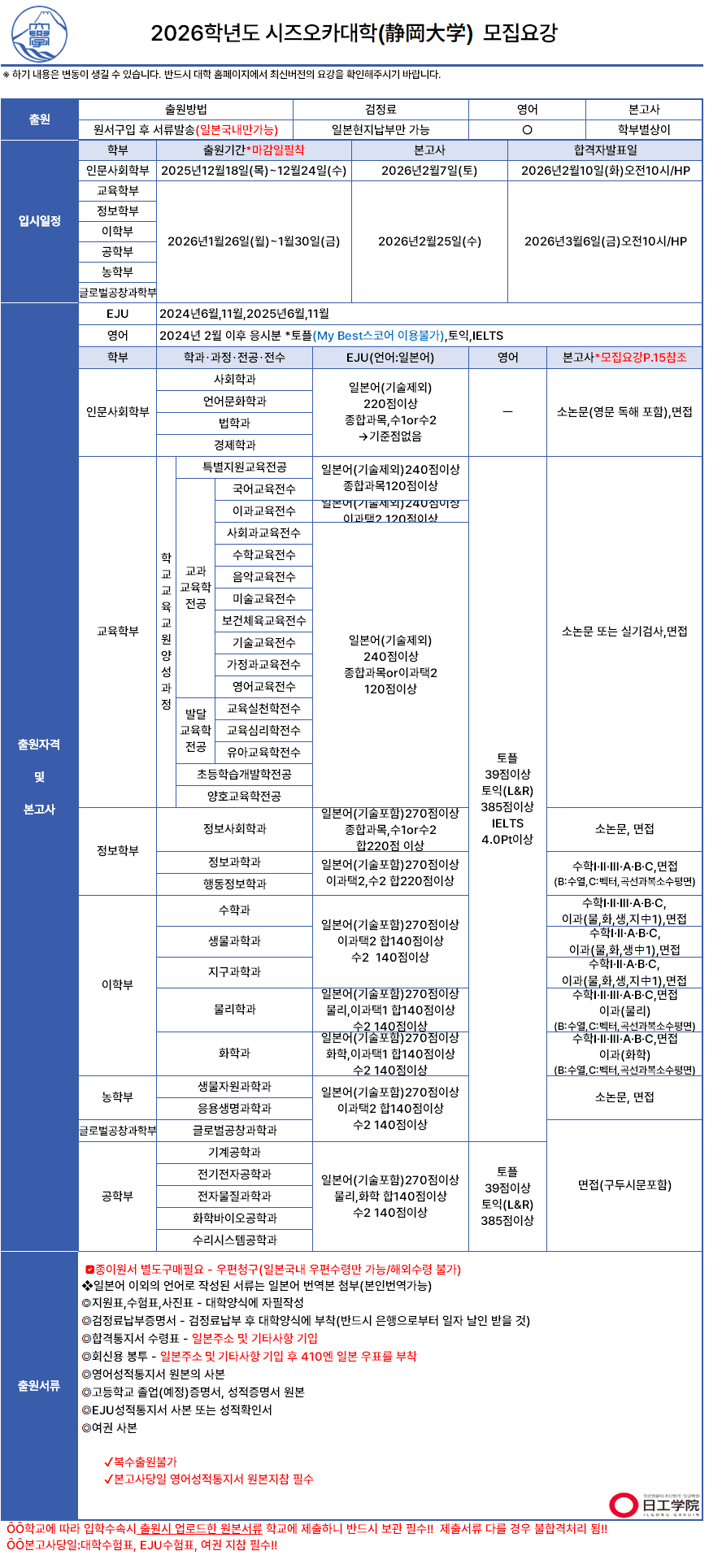 [국립] 2026학년도 시즈오카대학 모집요강