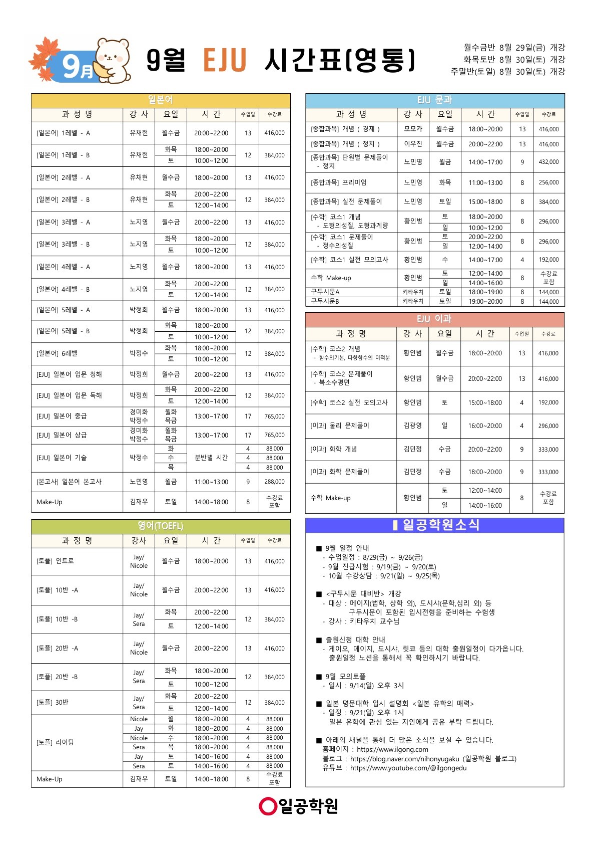 [EJU] 25년 9월 영통캠퍼스 시간표