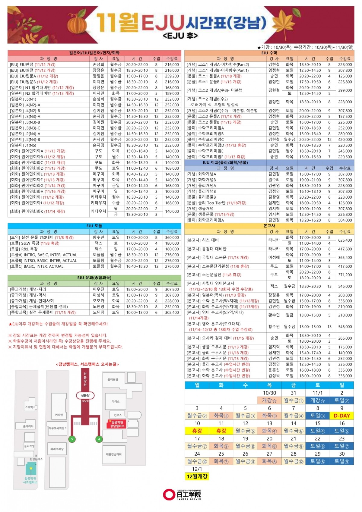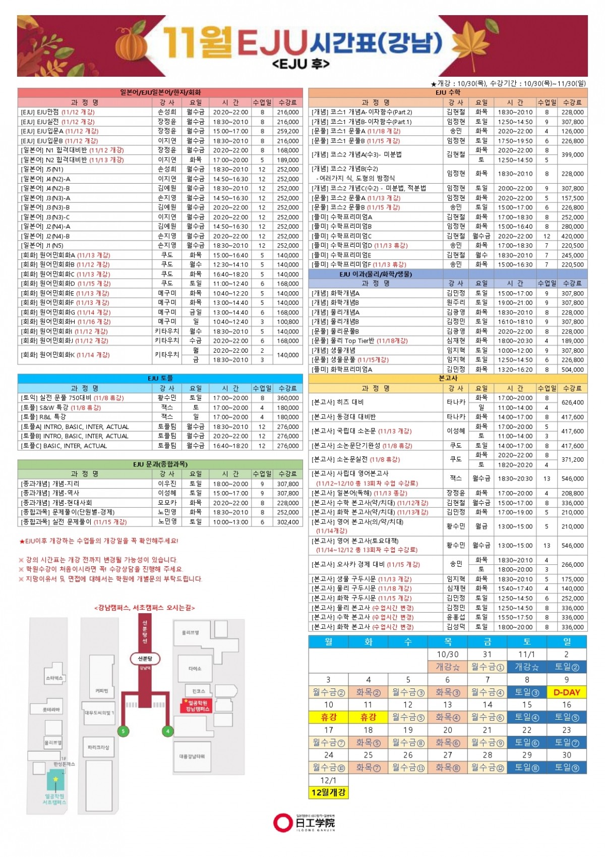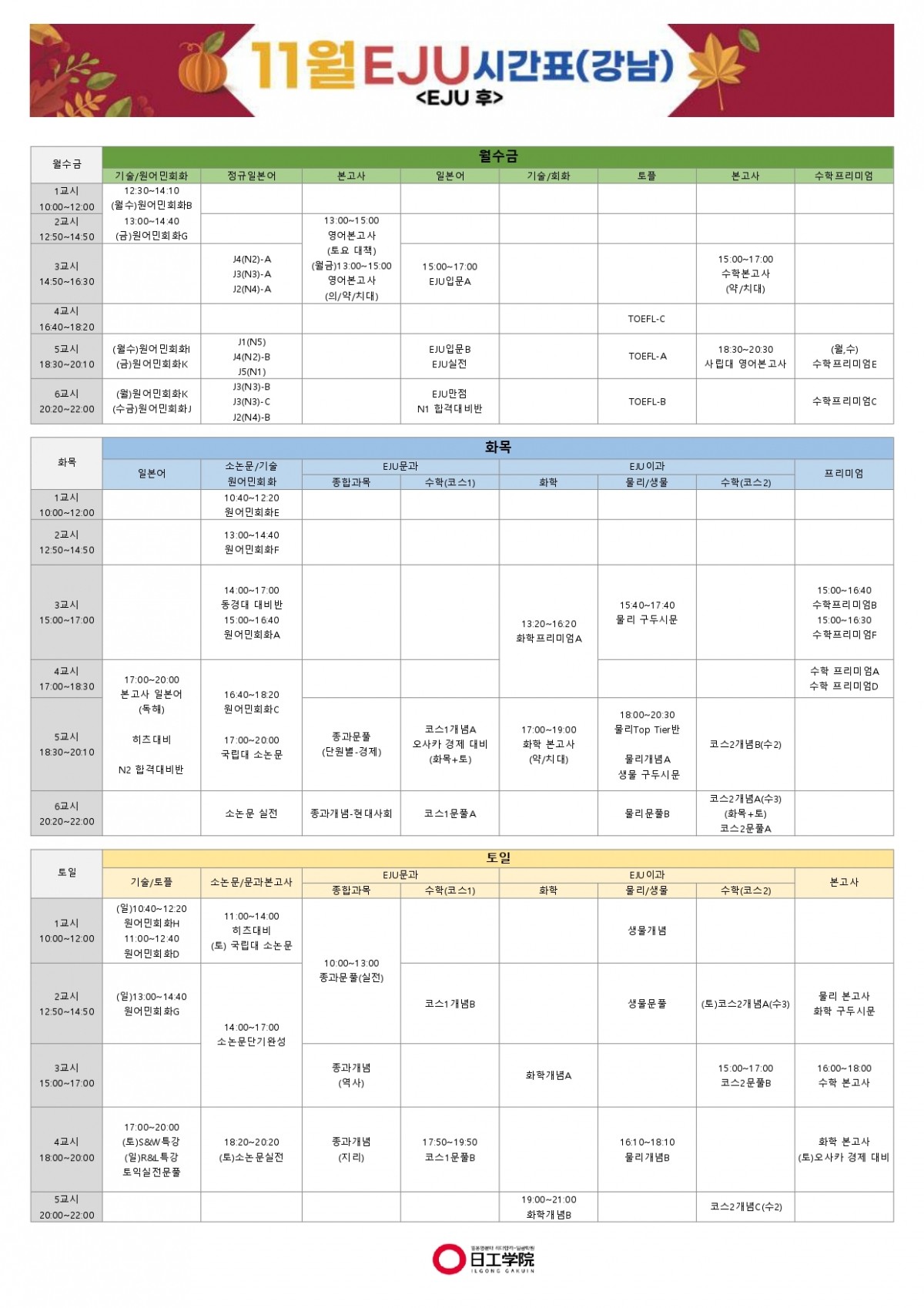 [EJU후] 25년 11월 강남캠퍼스 시간표