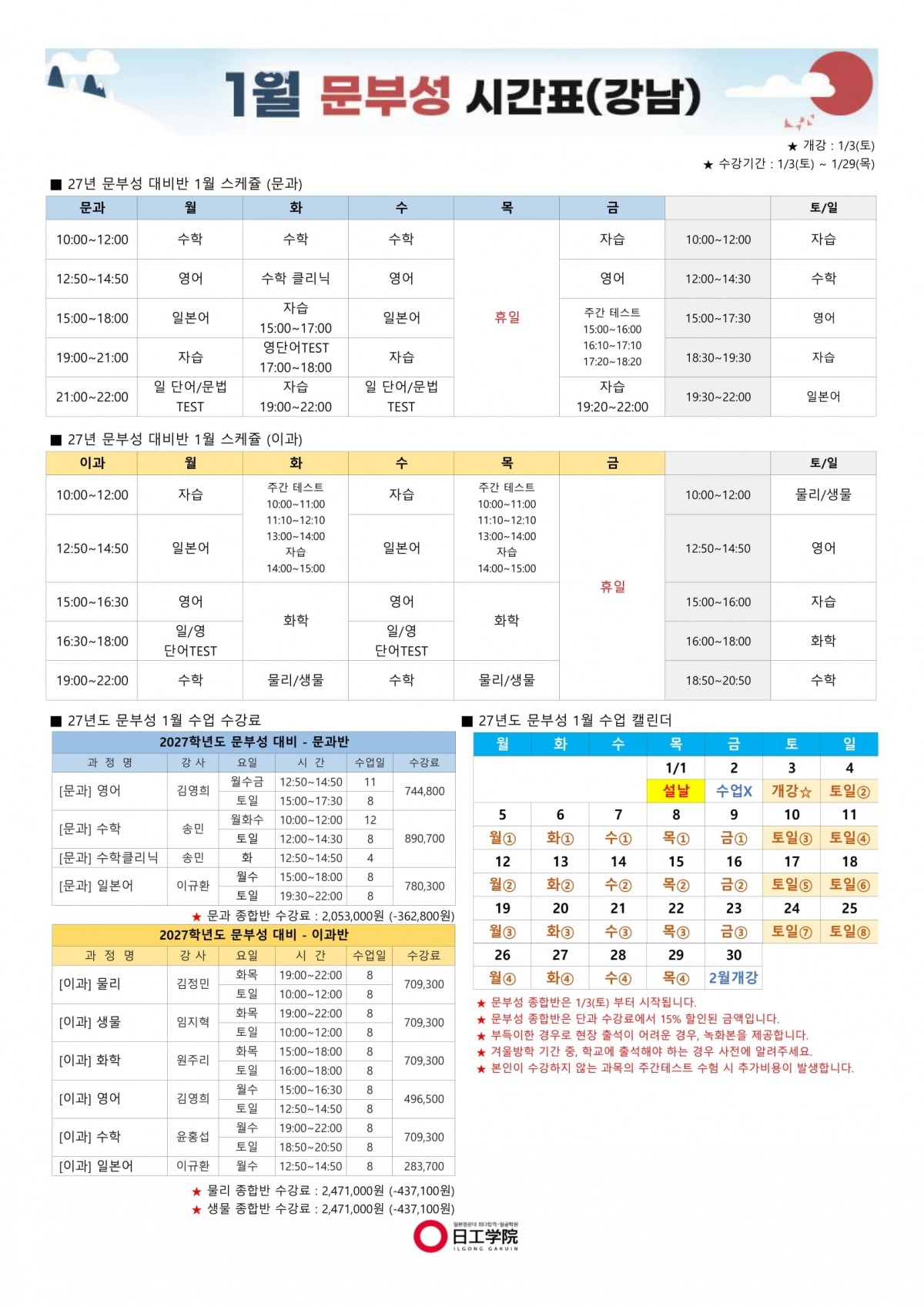 [문부성 27년 대비] 26년 1월 강남캠퍼스 시간표